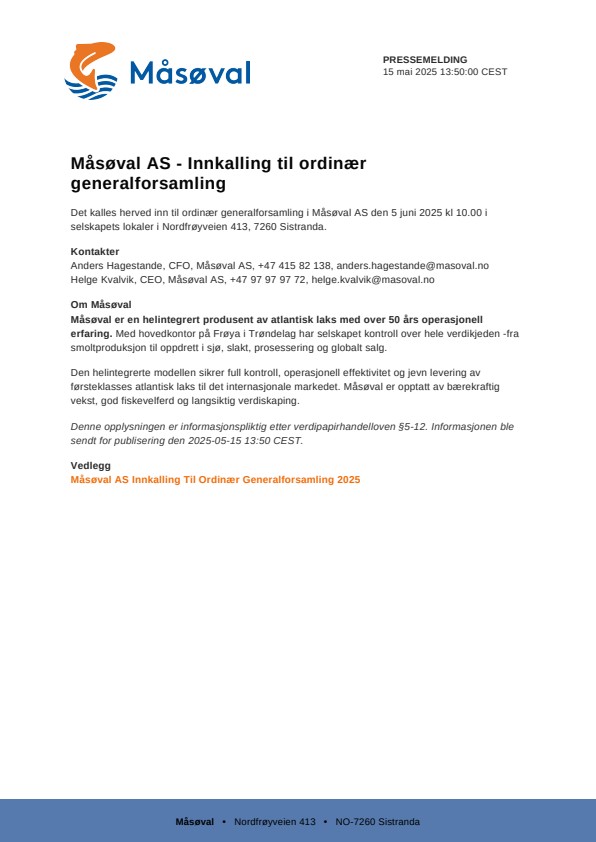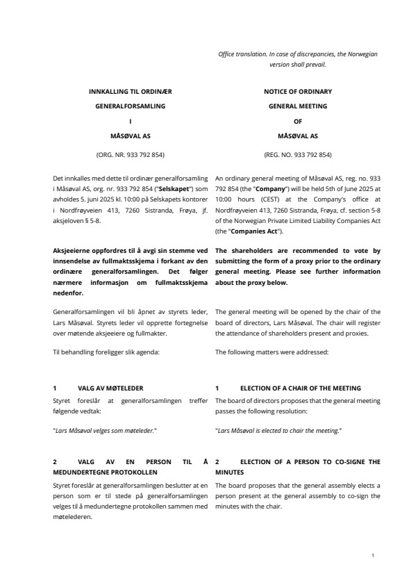 Det kalles herved inn til ordinær generalforsamling i Måsøval AS den 5 juni 2025 kl 10.00 i selskapets lokaler i Nordfrøyveien 413, 7260 Sistranda.