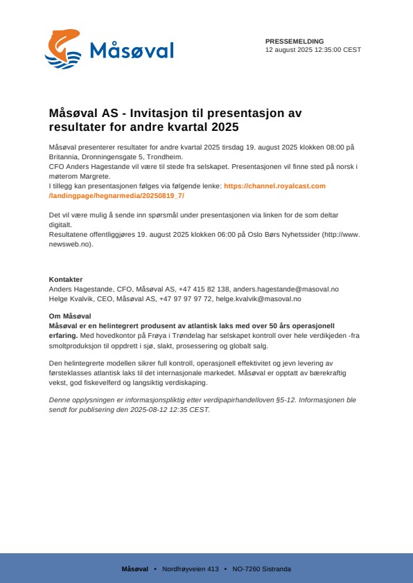 Måsøval presenterer resultater for andre kvartal 2025 tirsdag 19. august 2025 klokken 08:00 på Britannia, Dronningensgate 5, Trondheim.
