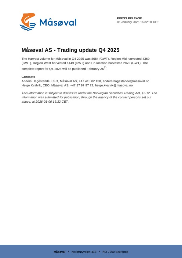The Harvest volume for Måsøval in Q4 2025 was 8684 (GWT). Region Mid harvested 4360 (GWT), Region West harvested 1449 (GWT) and Co-location harvested 2875 (GWT). The complete report for Q4 2025 will be published February 26th.